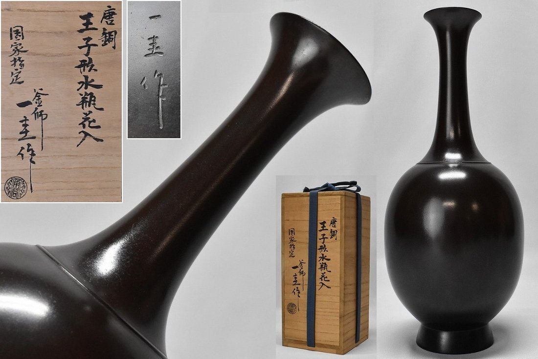 国家指定 人間国宝【角谷 一圭】唐銅 王子形水瓶 花入 花瓶 花生 高25.8cm 共箱 茶道具