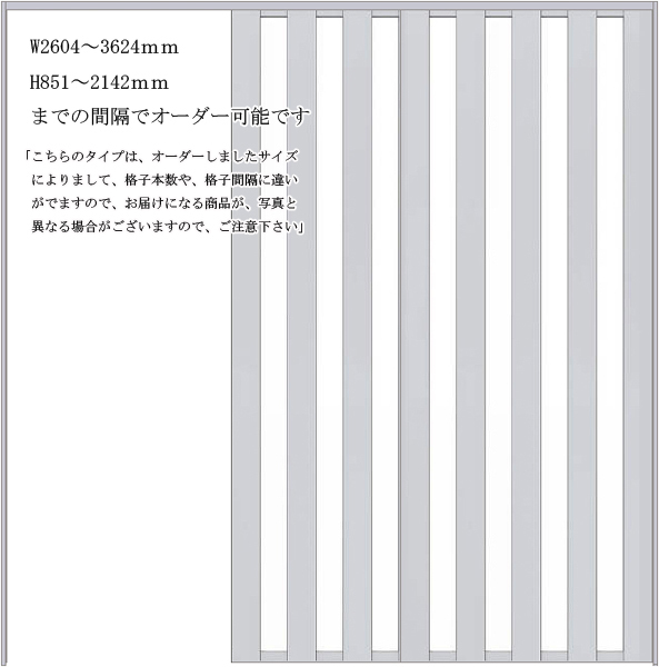 | 商品サイズ | W2604~3624mm H851~2142mmまでの間で自由にオーダーして手配可能です。 |