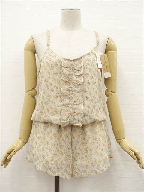 > 新品タグ付 Crazy about anything ひざ丈 ノースリーブ 洗えるキュロットワンピース M グレージュ地 オレンジ 小花柄 【メール便可】