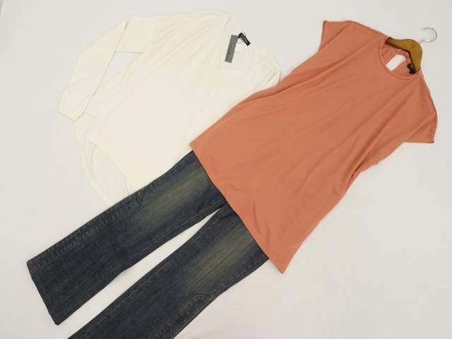 > 美品 one way等 半袖チュニック+長袖カットソー+デニムパンツ コーディネート3点セット M相当 オレンジ/白/青 カジュアル・クール系 20代