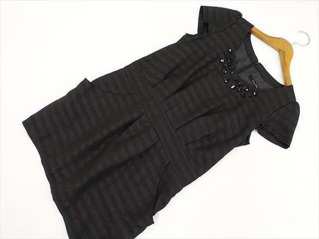 - 美品 ウヴラージュクラス OUVRAGE CLASSE ひざ丈 フレンチスリーブ 半袖 ペンタゴンネック ワンピース 黒×銀 ボーダー柄 【メール便可】