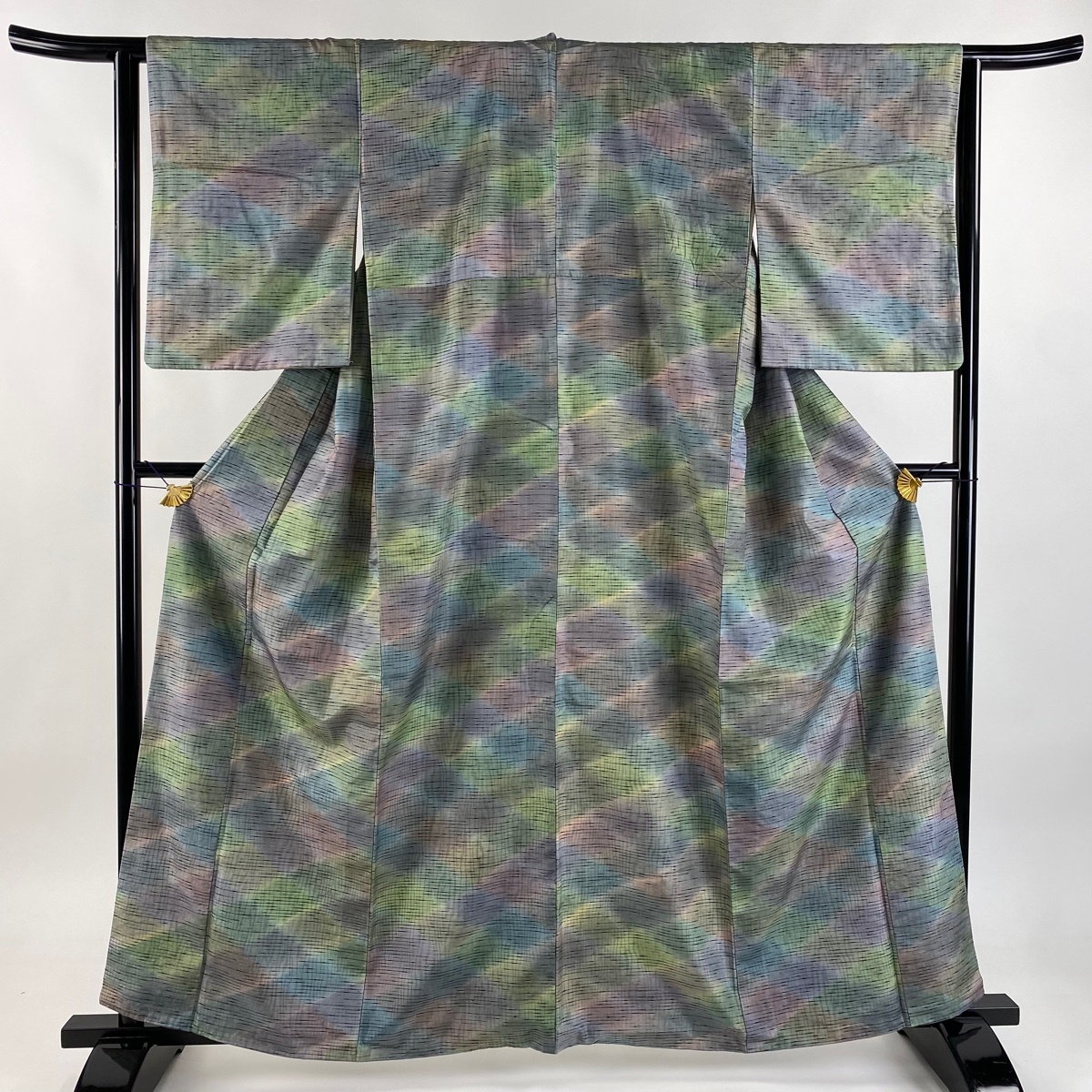 > 小紋 身丈161cm 裄丈63cm S 袷 紬地 やまと 菱格子 ぼかし 灰紫 正絹 名品 【中古】