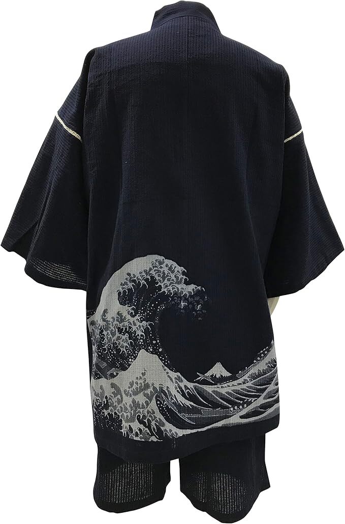 - [江戸てん]3L 一点物 甚平 日本製 久留米しじら織り 綿100% 抜染 和柄 北斎 波 紺