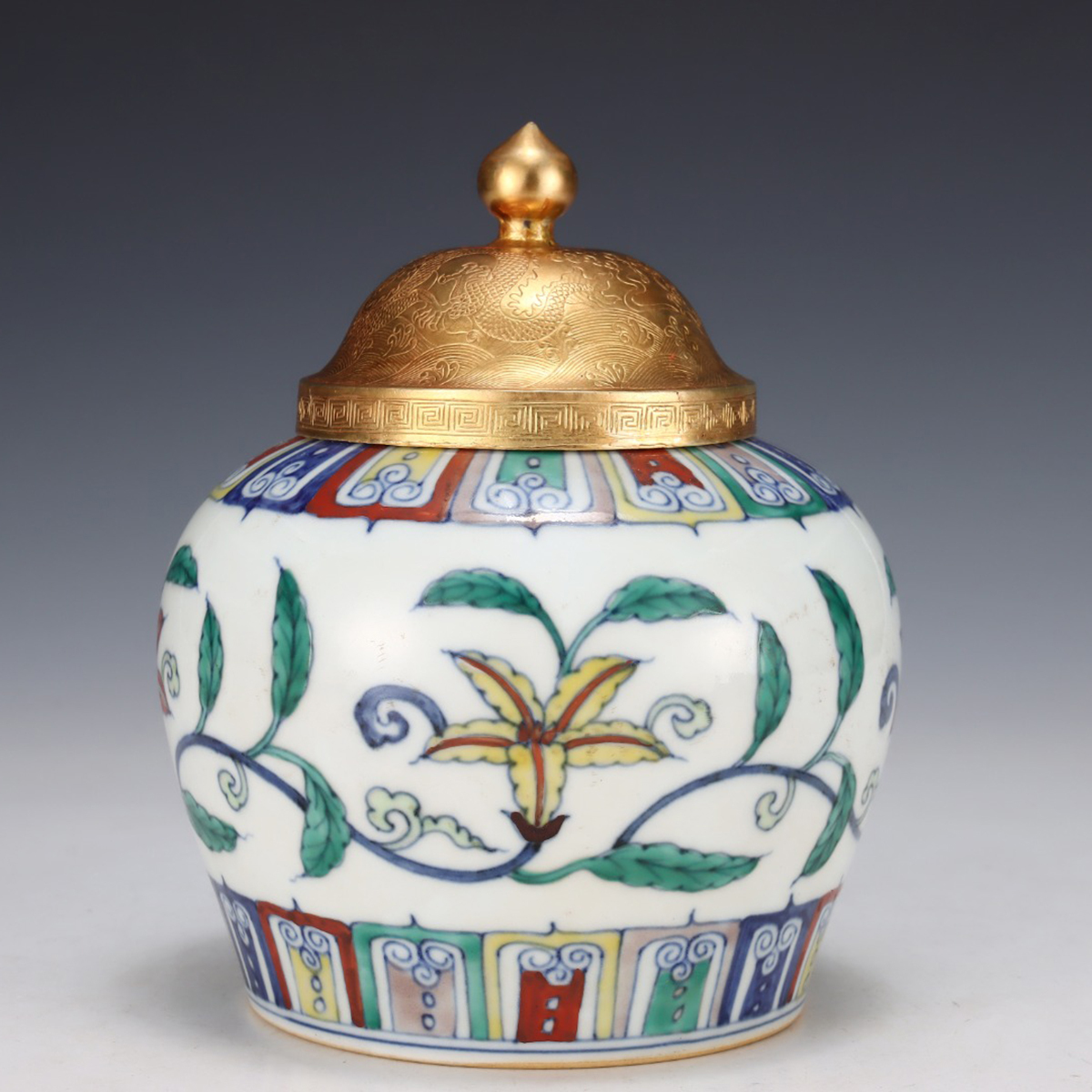 - ▽鴻▽明朝時代 陶磁器 成化年製 斗彩子花紋天字罐 銅金蓋 時代木箱付き 染付 時代物 中国古美術 骨董品