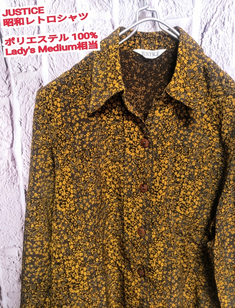 - ★送料無料★ 昭和レトロ デザインシャツ JUSTICE ポリシャツ 柄シャツ Medium 相当