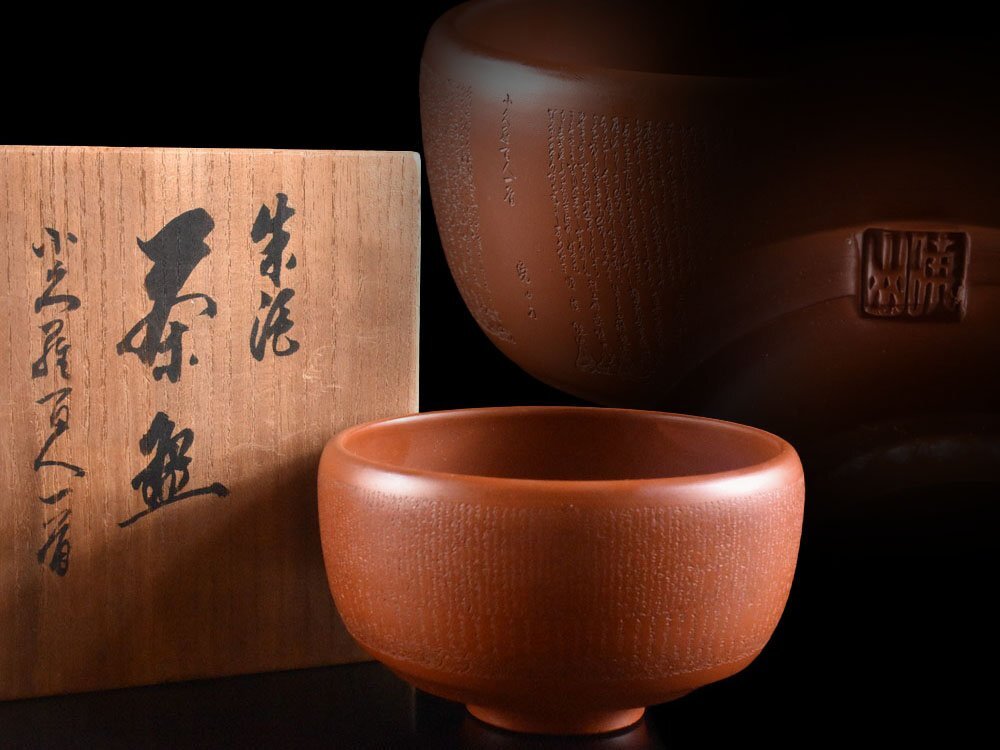 - 【雲】某収集家放出品 伝統工芸士 水上暁山 常滑焼 朱泥小久羅百人一首 茶碗 直径13cm 共箱 古美術品(旧家蔵出)CY584 CTDkjuy