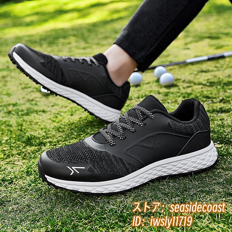 > 完売◆ゴルフシューズ メンズ フィット感 スポーツシューズ 新品 スニーカー 幅広 運動靴 スパイクレス 軽量 撥水 弾力性 ブラック 26.0cm