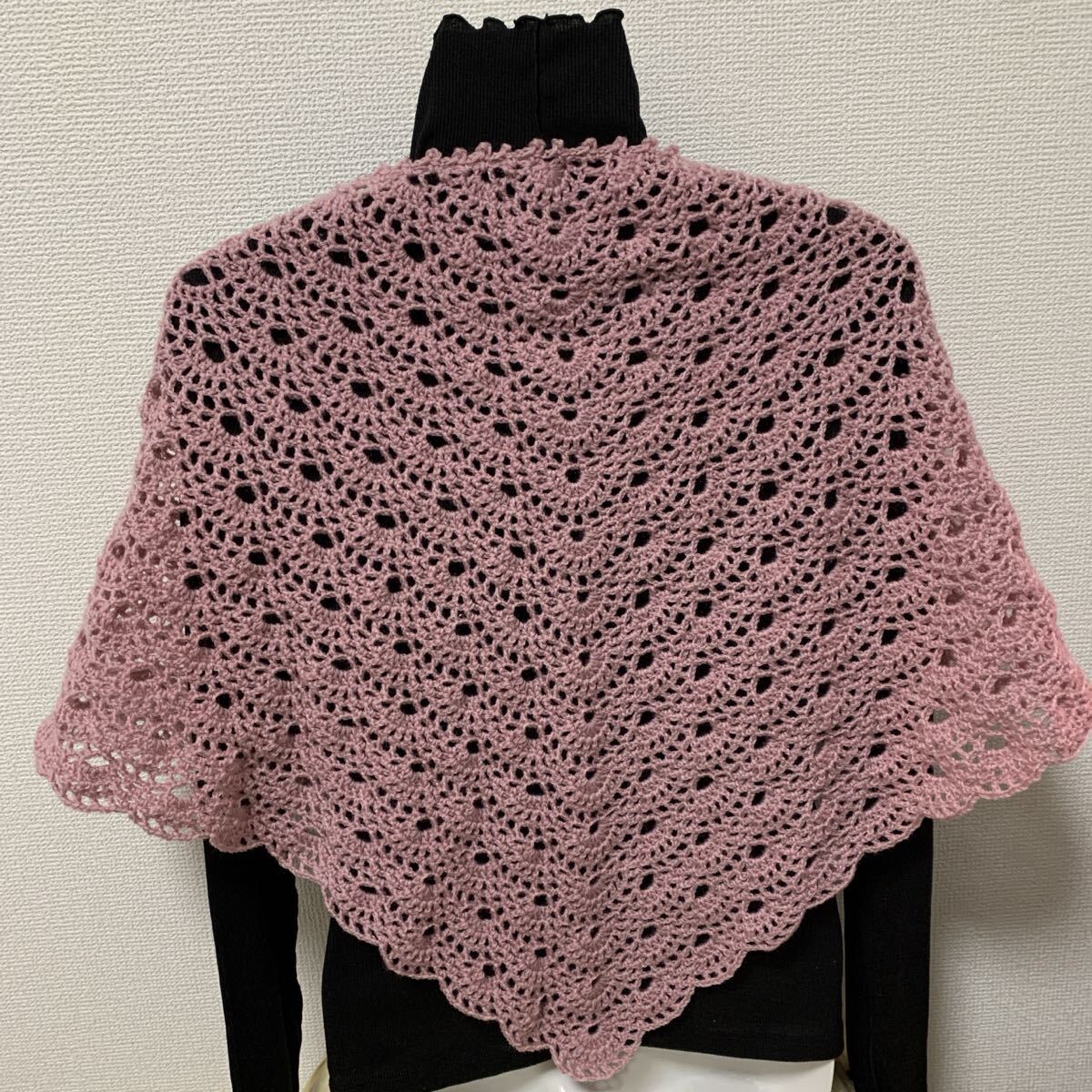 - 【a74】かぎ針 シンプル 透かし シェル編み 三角 ショール 桜ピンク