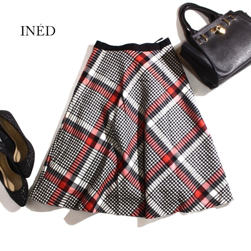 - 美品 イネド INED 株) フランドル 秋 冬 毛99% チェックスカート 7号 ブラック 黒 レッド 赤 ホワイト 白 ウールスカート スカート 上品