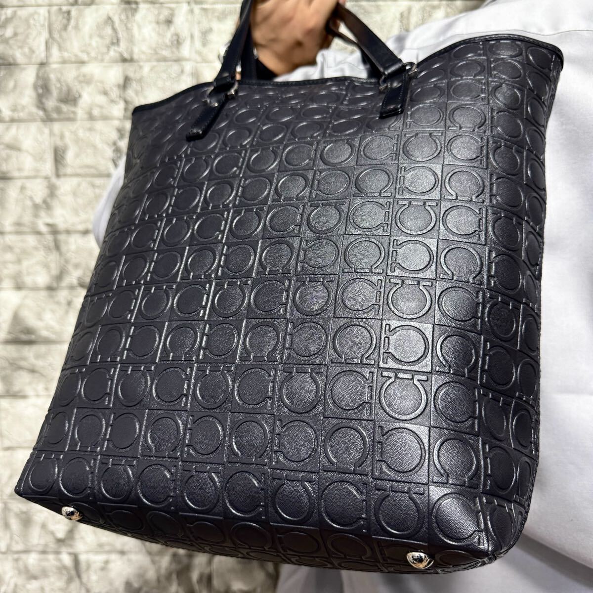 - 美品/A4収納◎ Salvatore Ferragamo フェラガモ ガンチーニ エンボス 総柄 メンズ ビジネス レザー トートバッグ 肩掛け ブラック 黒