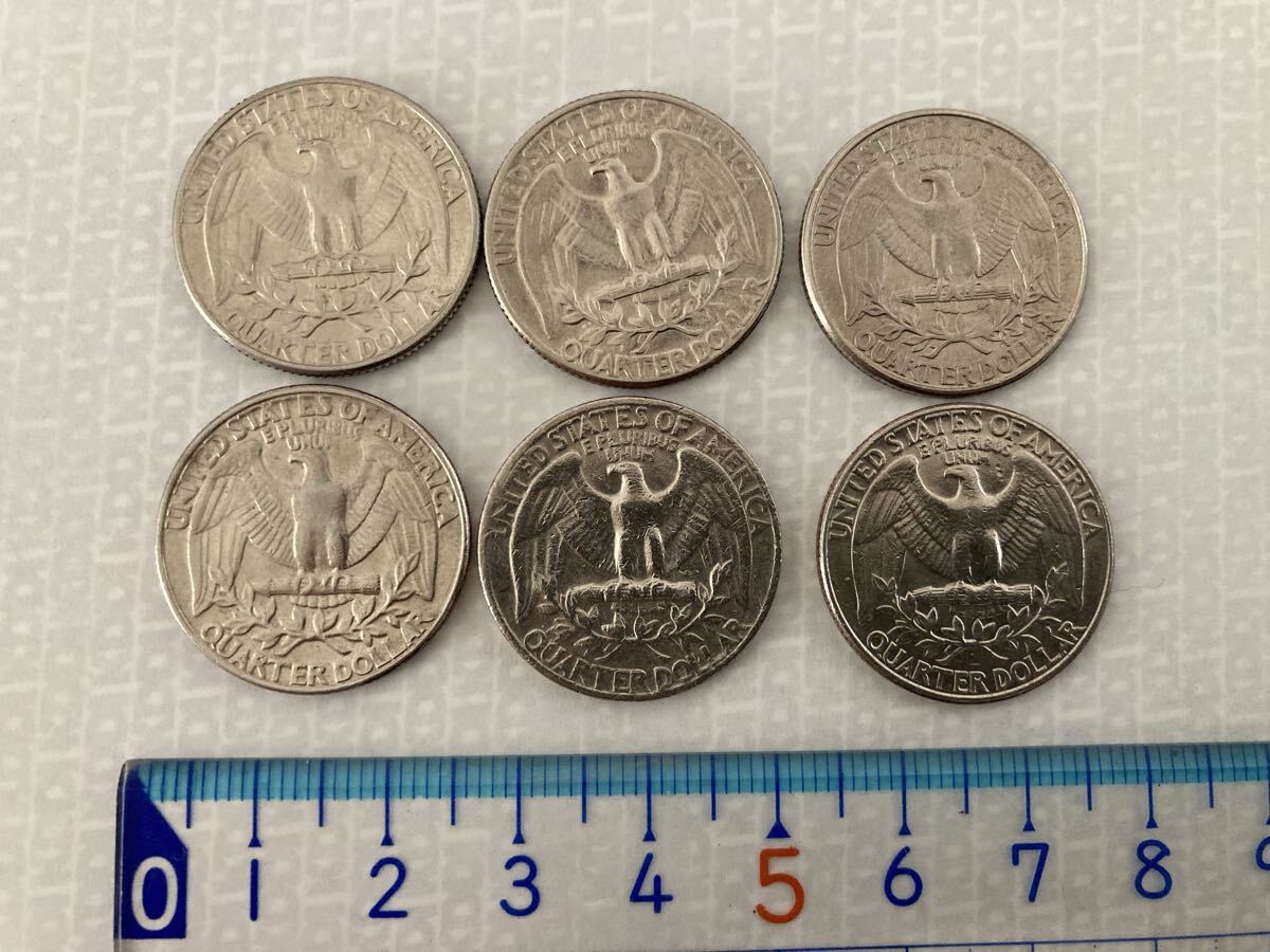- アメリカ 、25セント(クウォータードル、QUARTER DOLLAR)・コイン、6枚、若干の汚れあり
