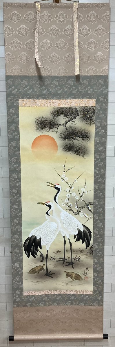 > S278 【模写】掛け軸 1点 【松竹梅鶴亀】 作者:山下春月 縁起 つる かめ 日本古美術 中国古美術 美術品 骨董 現状品 約185.5×53㎝