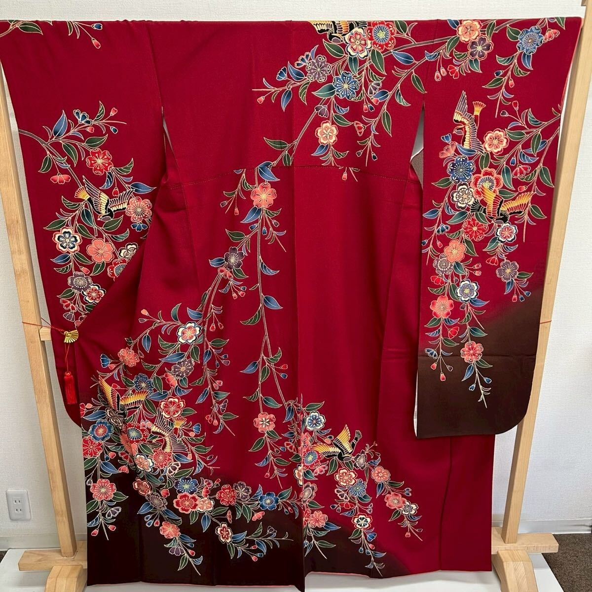 - 振袖 裄67 ちりめん地 花喰い鳥 草花染め 着物 正絹 W-5091