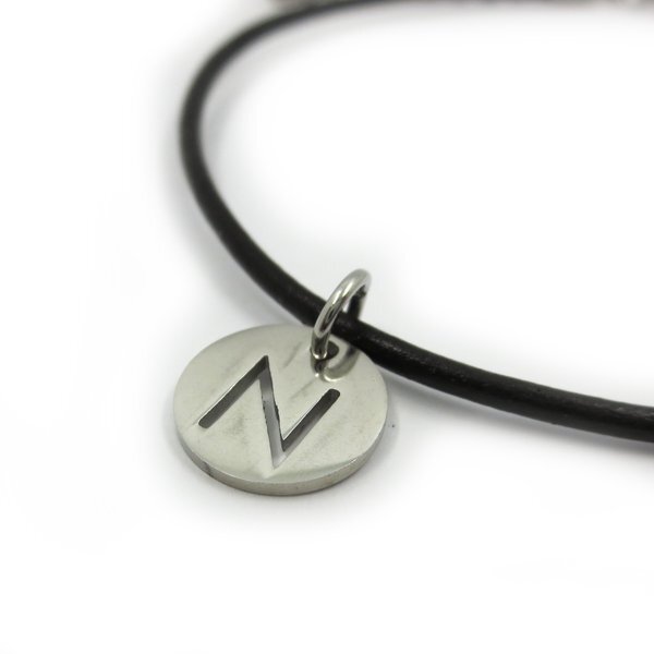 - N レザーアンクレット イニシャルチャーム付き ラウンド型 ステンレス金具 25cm(21+4cmアジャスター)