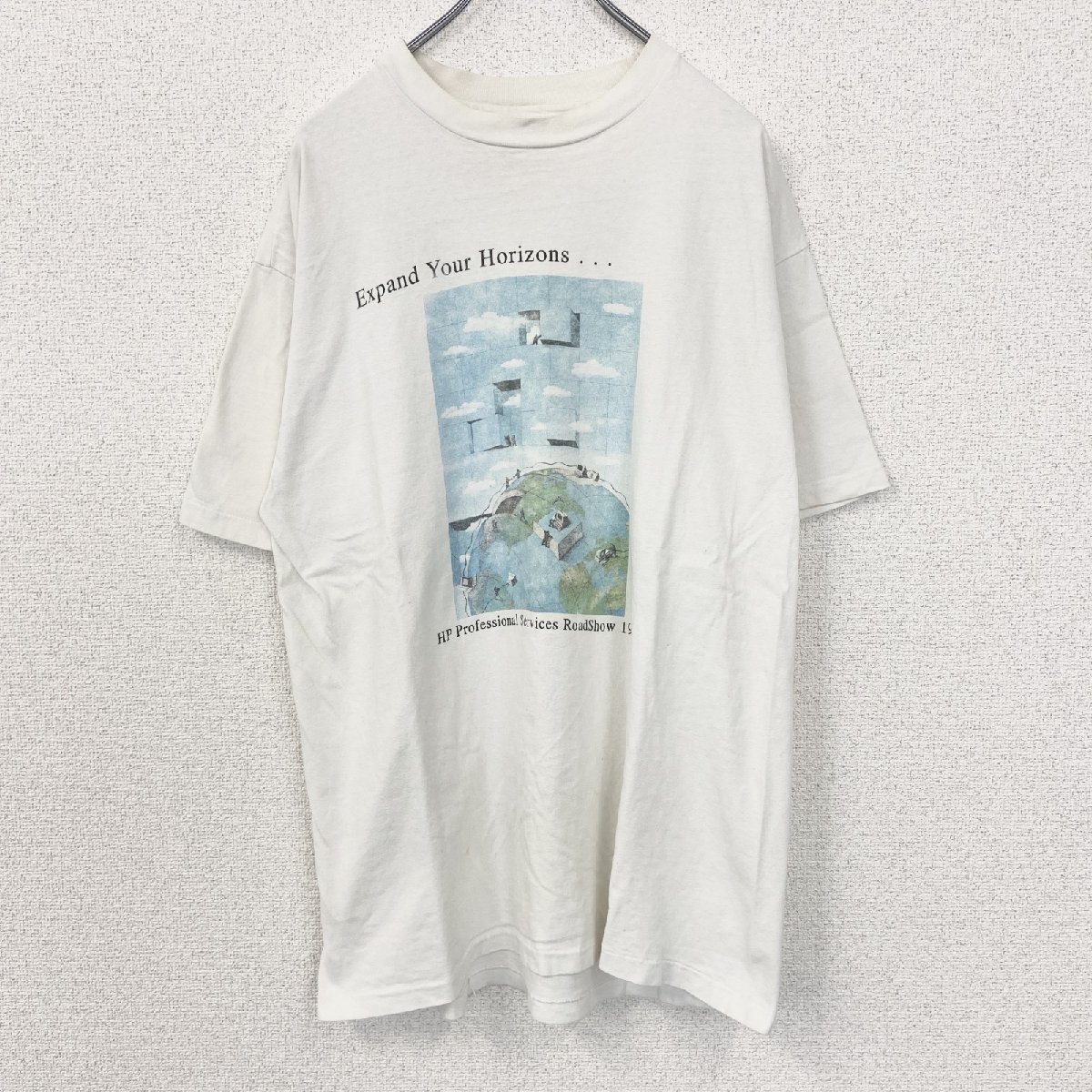 > 古着 used Hanes ヘインズ 半袖プリントTシャツ シングルステッチ 90s US製 カジュアルデザイン 白 Lサイズ