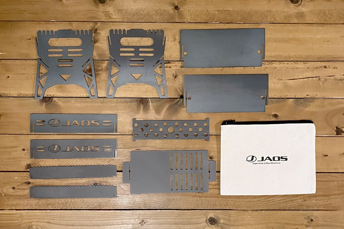 本体は熱間圧延加工で作られた鉄鋼材料の酸化皮膜を形成した黒皮採用し、サイズ以上の重厚感と質感を追求しました。JAOSロゴ入りのサイドパネルやフット部分は、燃焼効率の機能性とデザイン性の両立を実現しています。さらに、長期間に渡りご使用していただくことで、さまざまな表情を見せながら経年変化をお楽しみいただけます。また、本体を収納するコットンキャンバス製の収納ケースも付属しています。