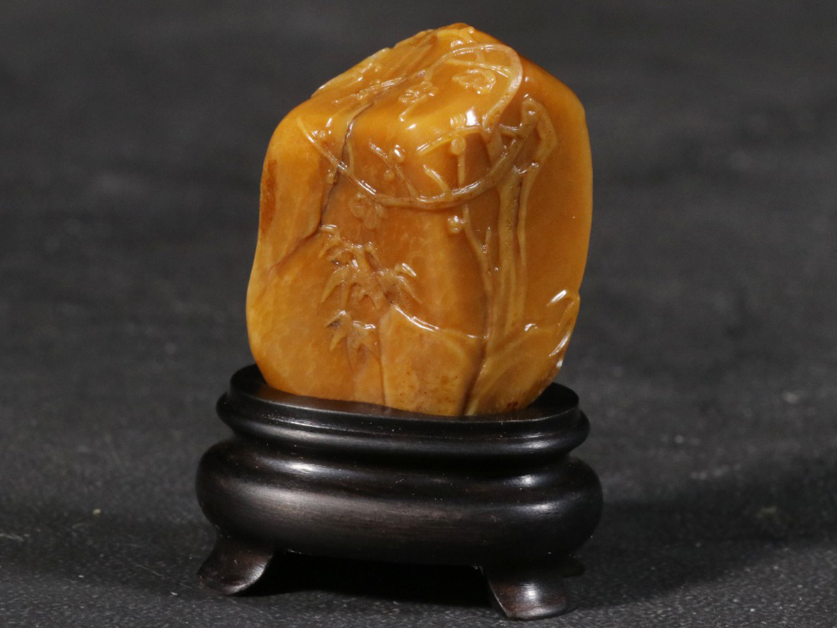 - ▽鴻▽金石篆刻 寿山石 田黄石彫 梅竹争春置物 鑑定書付き 箱付 時代物 中国古美術 骨董品A3