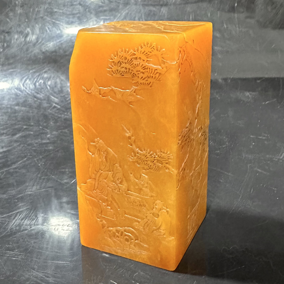 - ▽鴻▽清朝時代 寿山石 田黄石彫 山水人物紋素章置物 印材 箱付 時代物 中国古美術 骨董品