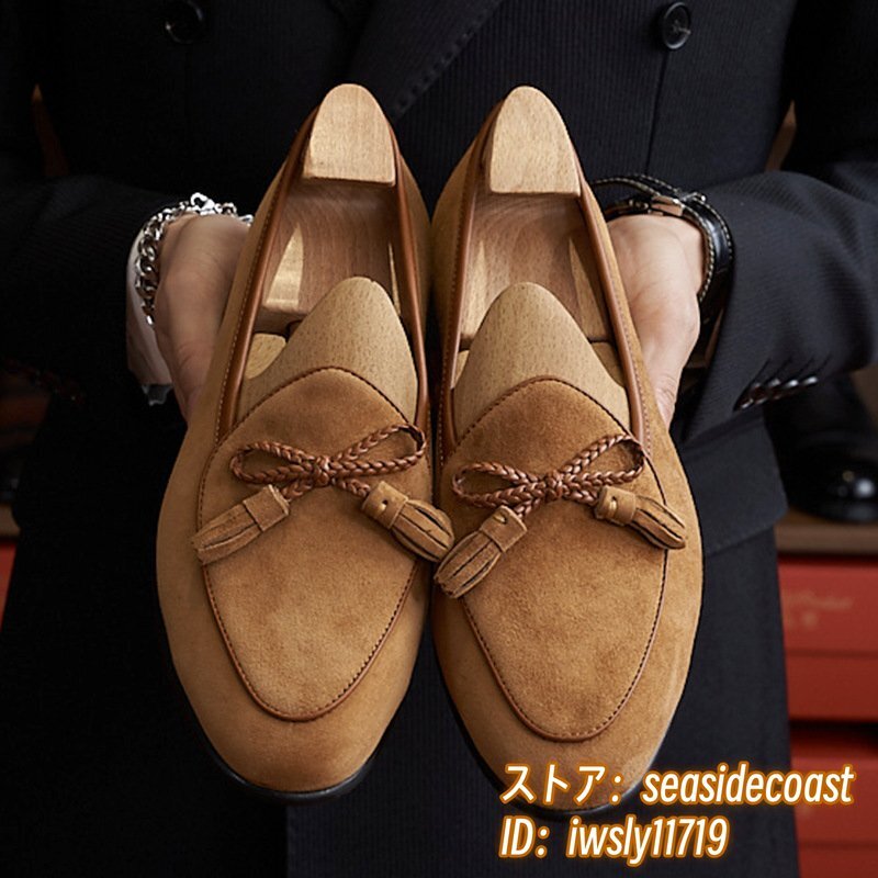 - 定価10万■最高級 ビジネスシューズ スエード革 職人手作り 本革 レザーシューズ タッセル ローファー 紳士靴 革靴 牛革 ブラウン 25.0cm