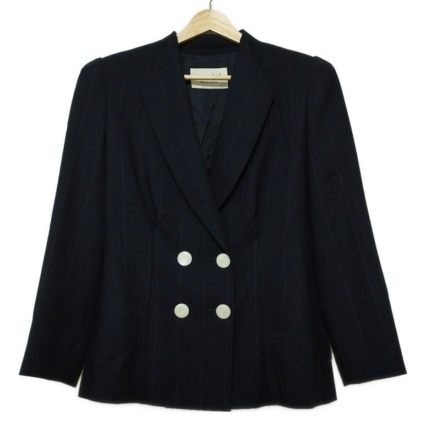 > ジュンアシダ JUN ASHIDA サイズ9 M - ダークネイビー×白 レディース 長袖/ストライプ/肩パッド/ダブル/秋/冬 美品 ジャケット