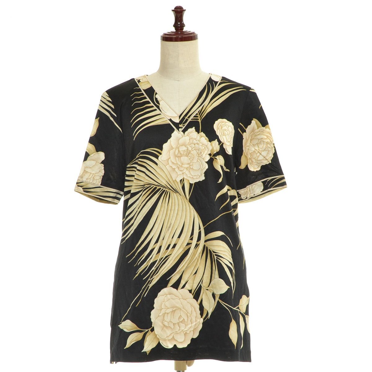 > ◇561728 LEONARD レオナール ◇カットソー 半袖Tシャツ 花柄VネックチュニックPO サイズL レディース 日本製 ブラック