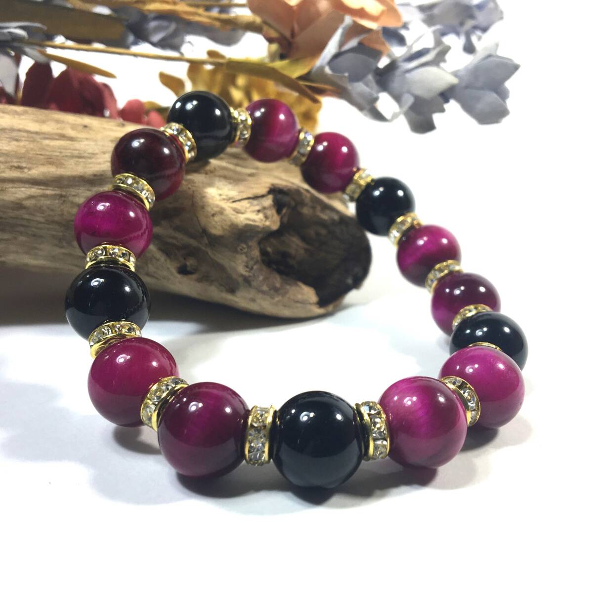 - ピンクタイガーアイ&オニキス パワーストーン ブレスレット 天然石ブレス (ゴールド) 12mm 幸運 開運 メンズ 男性♪