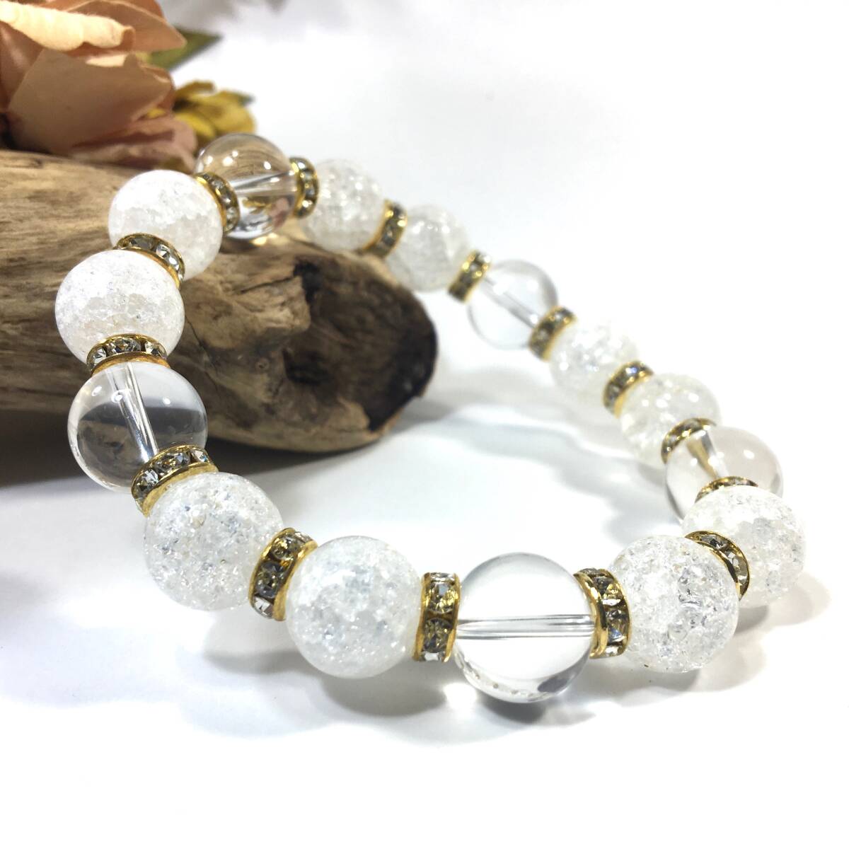 - クラック水晶&水晶 パワーストーン ブレスレット 天然性ブレス (ゴールド) 12mm 幸運 開運 メンズ 男性♪