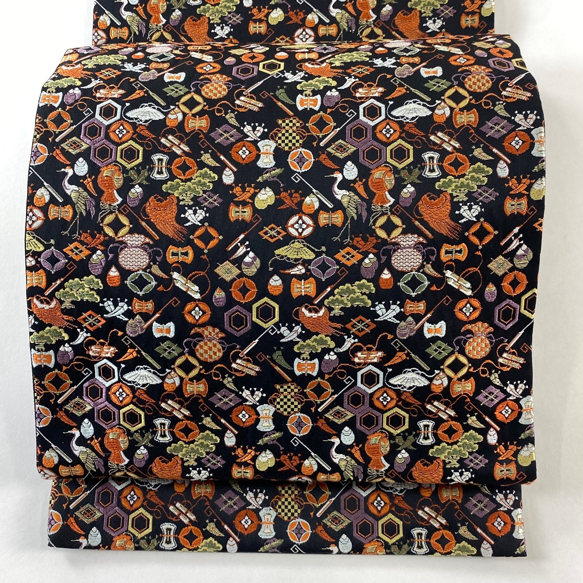 > 袋帯 名品 宝尽くし 亀甲 金糸 黒 六通 正絹 【中古】