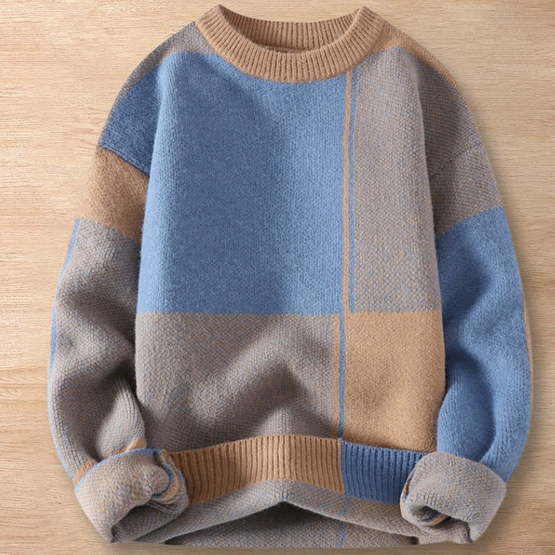 - Y217-L カーキ 新品DCKMANY ウール混 ニット セーター バイカラー切り替え クルーネック 暖かい 防寒 秋冬 メンズ カジュアル トップス