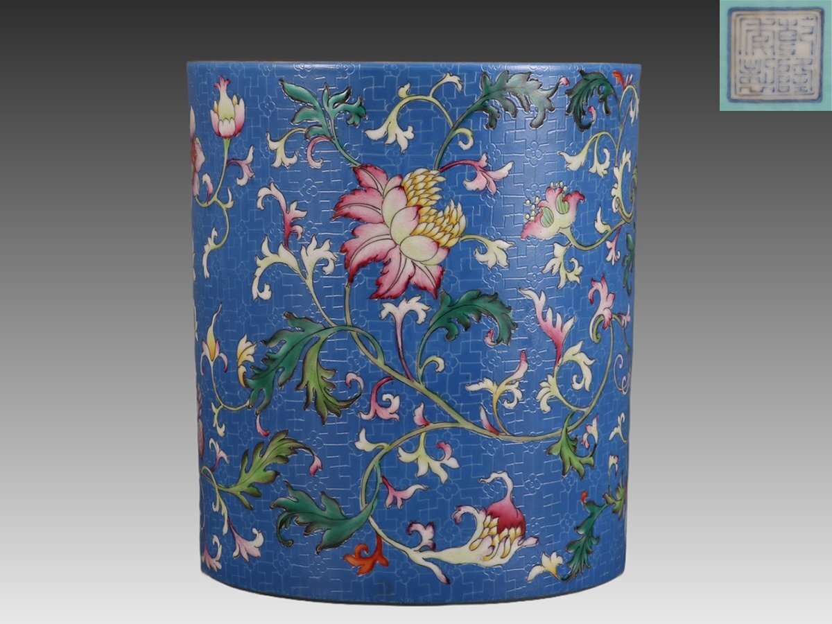 > ■大成美術■藍地軌道洋彩花卉紋筆筒 清乾隆年製款(検)清時代 染付 陶磁器 唐物 中国美術 骨董 古玩 277