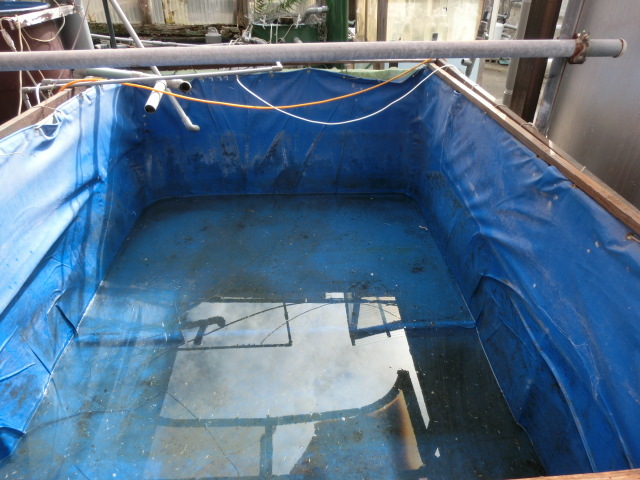 > 鉄枠シート池 約4トン強、高さ130cm塩ビ管直径15cm生物濾過槽とポリドラム物理濾過槽、ストレーナー、吊り網のセットです