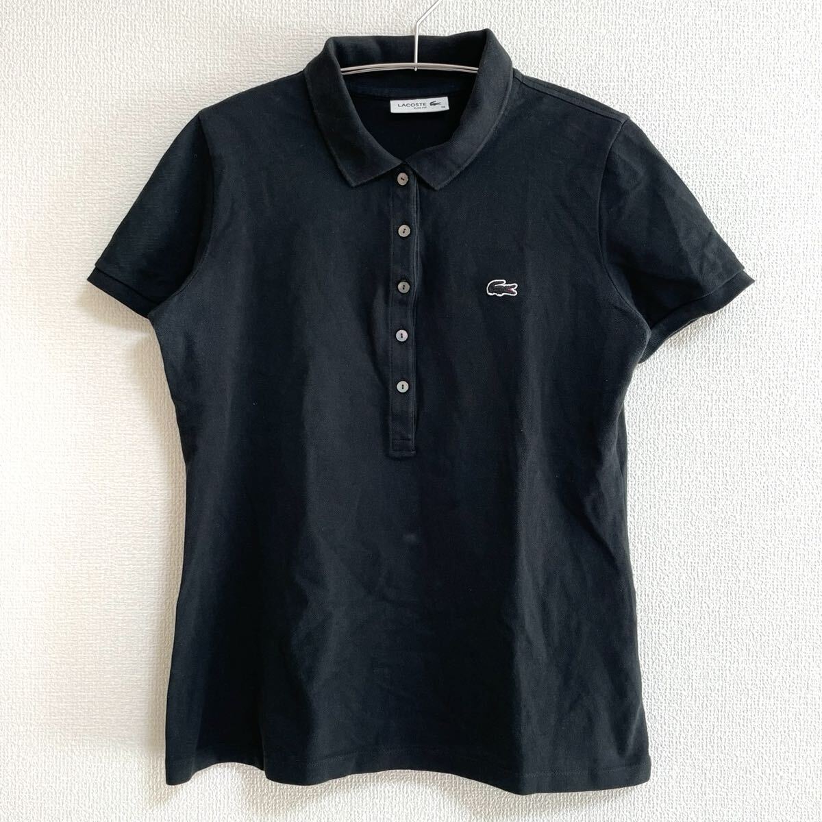 > LACOSTE ラコステ ポロシャツ レディース 38 M ブラック ワニロゴ 刺繍 美品 日本製 スリムフィット 半袖 黒 夏秋服 無地 人気 鹿の子 上