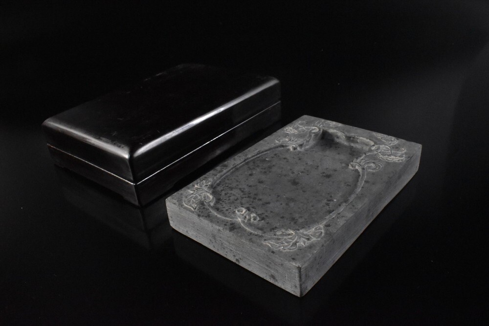 - 【雲】某資産家委託品 石製 花彫刻 硯 木箱 書道具 古美術品(書道具墨筆石) F8548