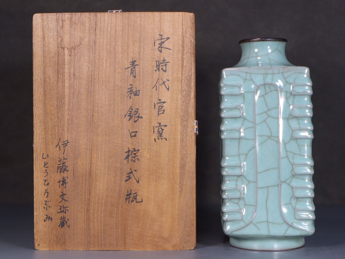- ▽鴻▽宋時代 陶磁器 官窯青釉包銀口琮式瓶 共箱 時代物 中国古美術 骨董品