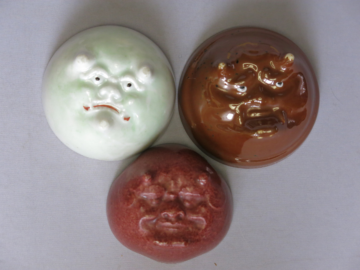 - 鬼面盃三個、磁器、光沢釉の鬼面と色絵細密画の見込、珍品、九谷焼か