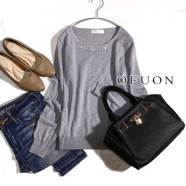 > 美品 OFUON stylish オフオン スタイリッシュ ラインストーン付き ウール混紡 ニット セーター 38号 M 秋 冬 25C10