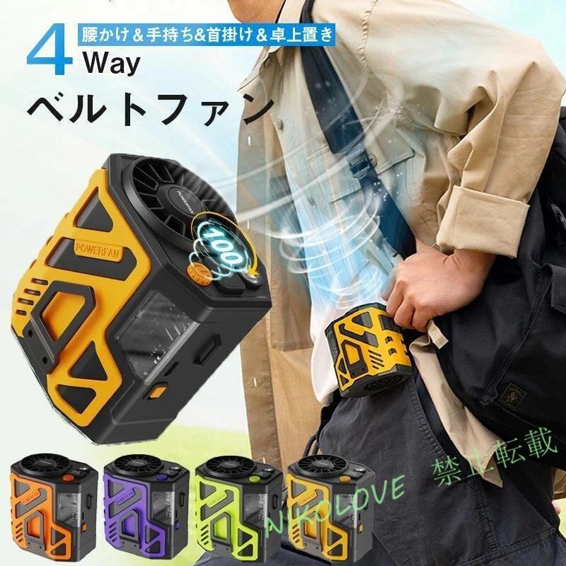 - 腰掛け 扇風機小型 首かけ 首掛け扇風機 3WAY 羽なし ベルトファン 最大20時間送風 大容 6000mAh 携帯 手持ち 卓上 USB充電式オレンジ