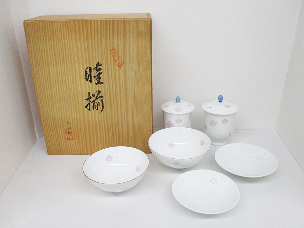 > B25-2395 有田焼 西山造 睦揃 蓋付湯呑 茶碗 平皿 花柄 在銘 夫婦 二組セット 和食器 陶芸 伝統工芸 箱付き 経年保管品