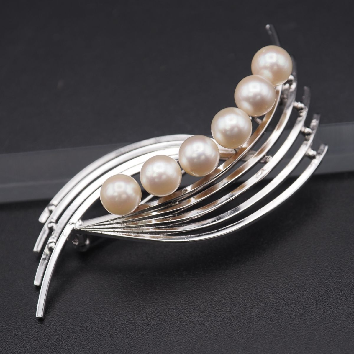 - H095 本真珠 6.3mm6珠 パール STERLING刻印 ブローチ デザイン シルバー コサージュ 6月誕生石
