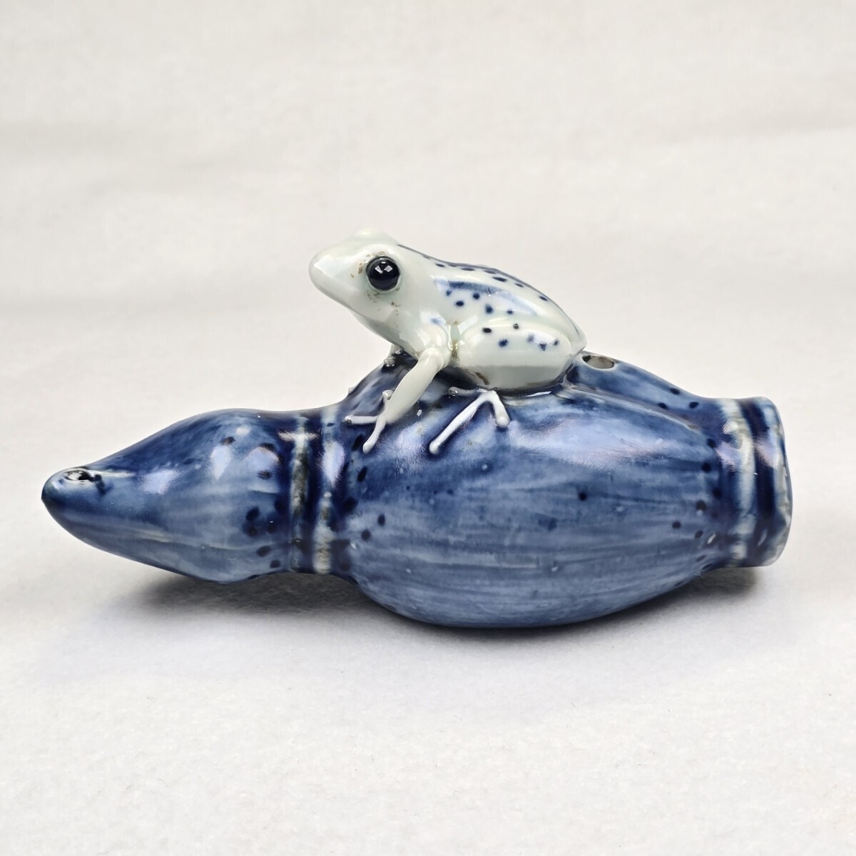 - 美品 中国古磁 青花 堆彫 蓮根蛙趣紋 水滴 硯滴 置物 清代白玉斎在銘 文房具