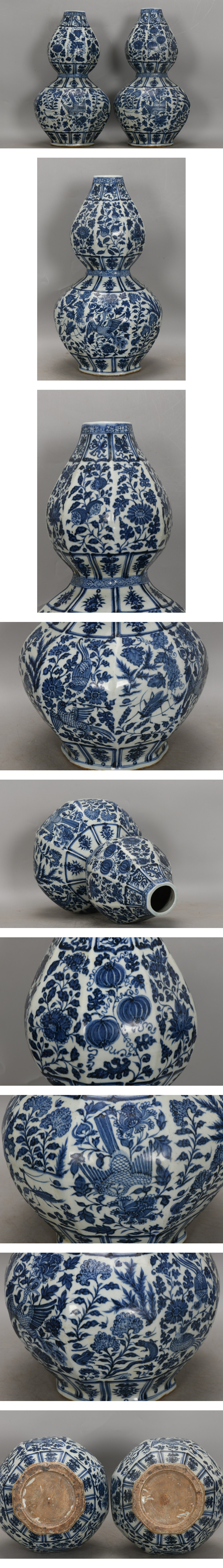 > ◆珍蔵◆中国古美術 元代 元青花 古陶磁 草虫八方葫芦瓶―對 細密細工造 擺件 骨董品 古賞物 時代物 A3
