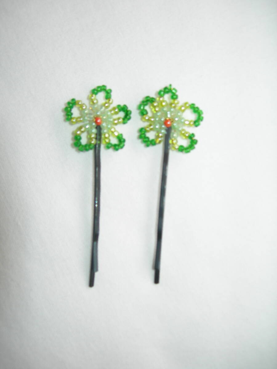- ビーズ ヘアピン 花(グリーン) ハンドメイド 新品