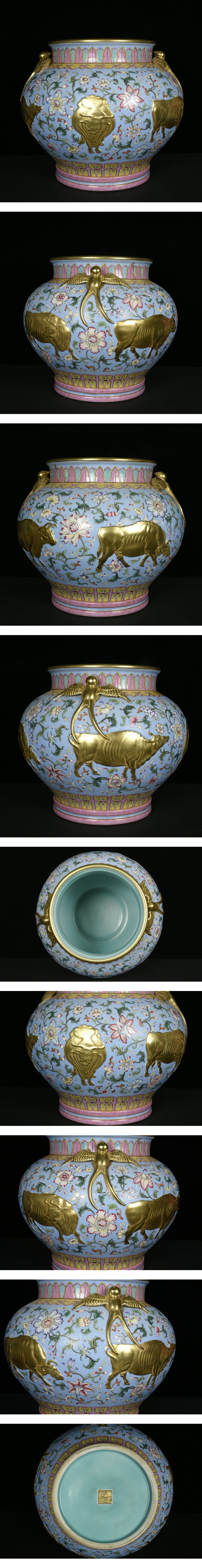 > NA231■大清乾隆年製款 粉青釉爬花 琺瑯彩描金 彫刻五牛図 燕耳壺 時代物 古玩 唐物 古陶磁器■