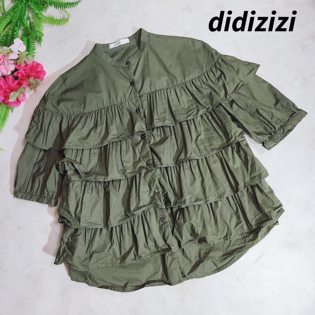 > didizizi フリル・ティアード・バンドカラー五分袖ブラウス カーキグリーン ラッフルブラウス ポプリン風の張りのある生地 68631