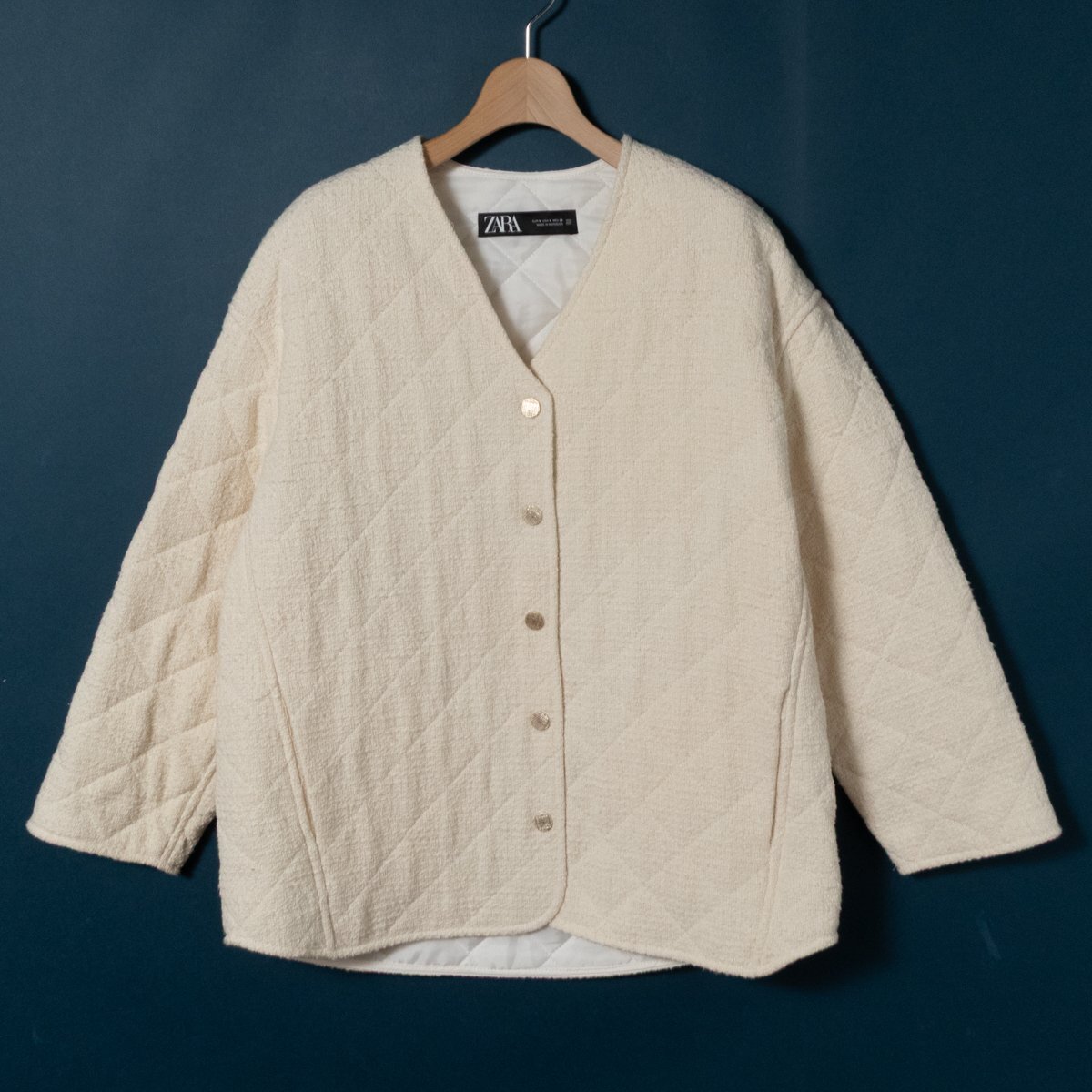 > ZARA ザラ GOLD BUTTON QUILTED JACKET Vネック キルティングブルゾン オフホワイト 白 S レディース ポリエステル キレイめ カジュアル