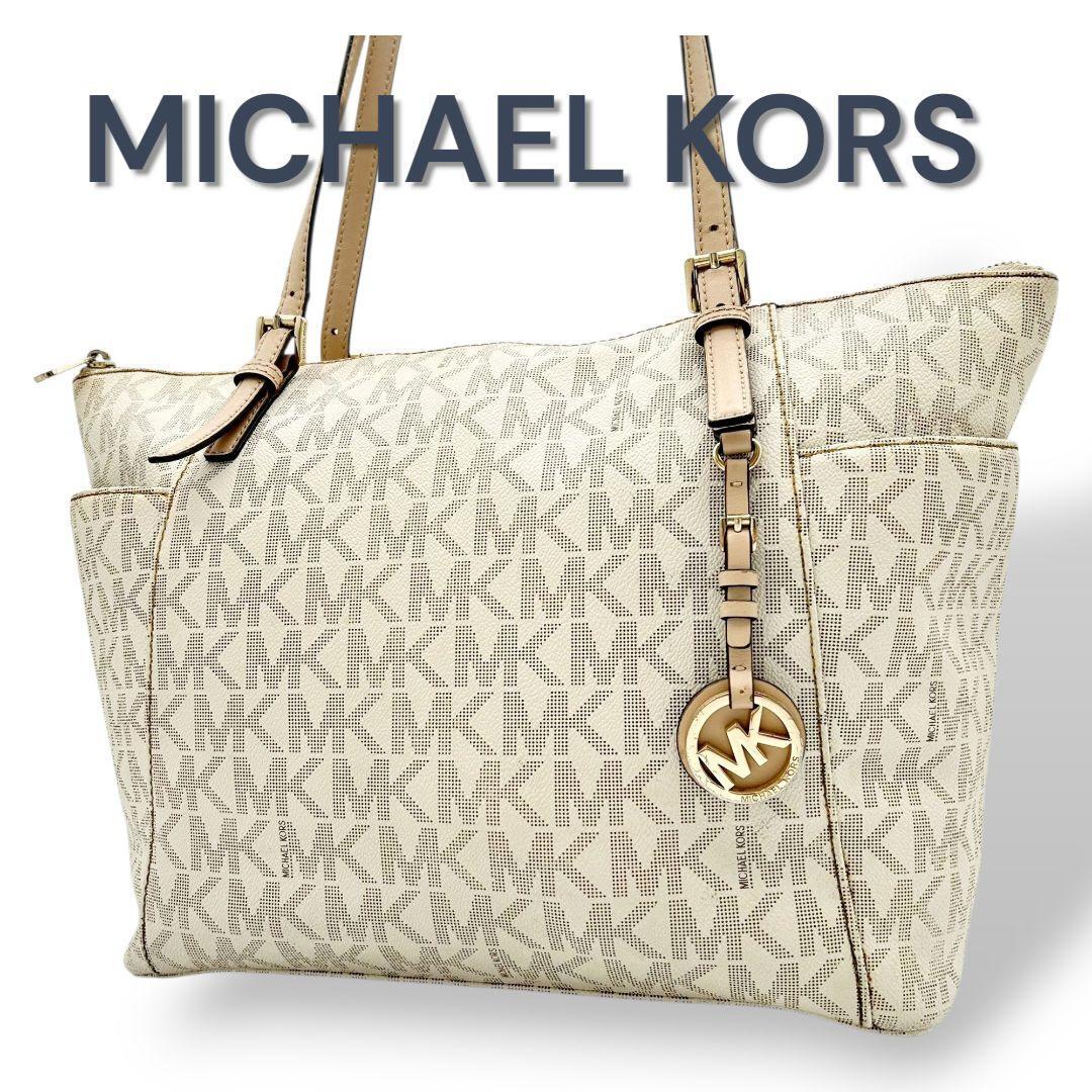 - 【大人気】MICHAEL KORS マイケルコース ベージュ トートバッグ A4収納可 MKロゴ 肩掛け MKチャーム A4収納 PVCレザー