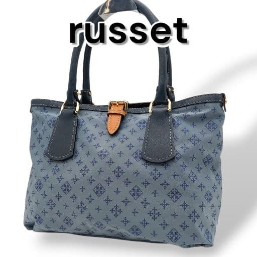 - 【美品】russet ラシット トートバッグ 総柄 ブルーグレー 人気 ナイロン 取手レザー総柄 ベルトバックル マグネット式 A4収納可