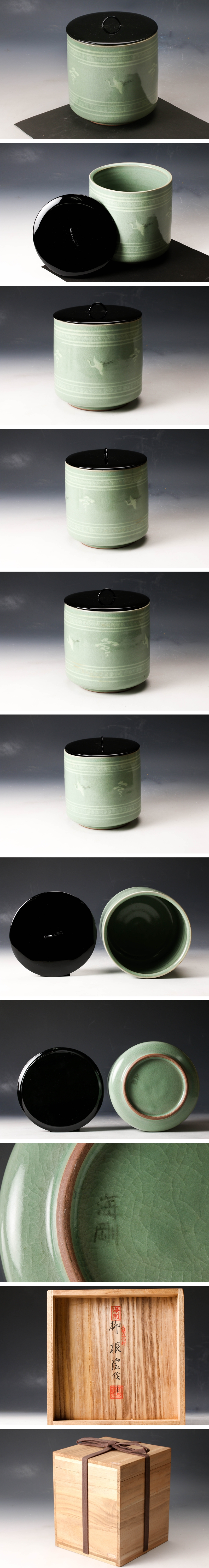 【佳香】韓国人間国宝 柳海剛(柳根瀅) 高麗青磁雲鶴文筒水指 共箱 塗蓋 茶道具 本物保証