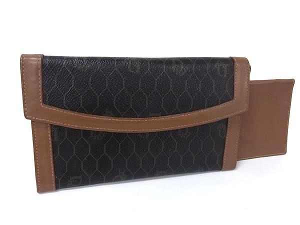 - 1円 ChristianDior クリスチャンディオール ヴィンテージ ハニカム柄 PVC×レザー がま口 二つ折り 長財布 ウォレット ブラック系 BM9852