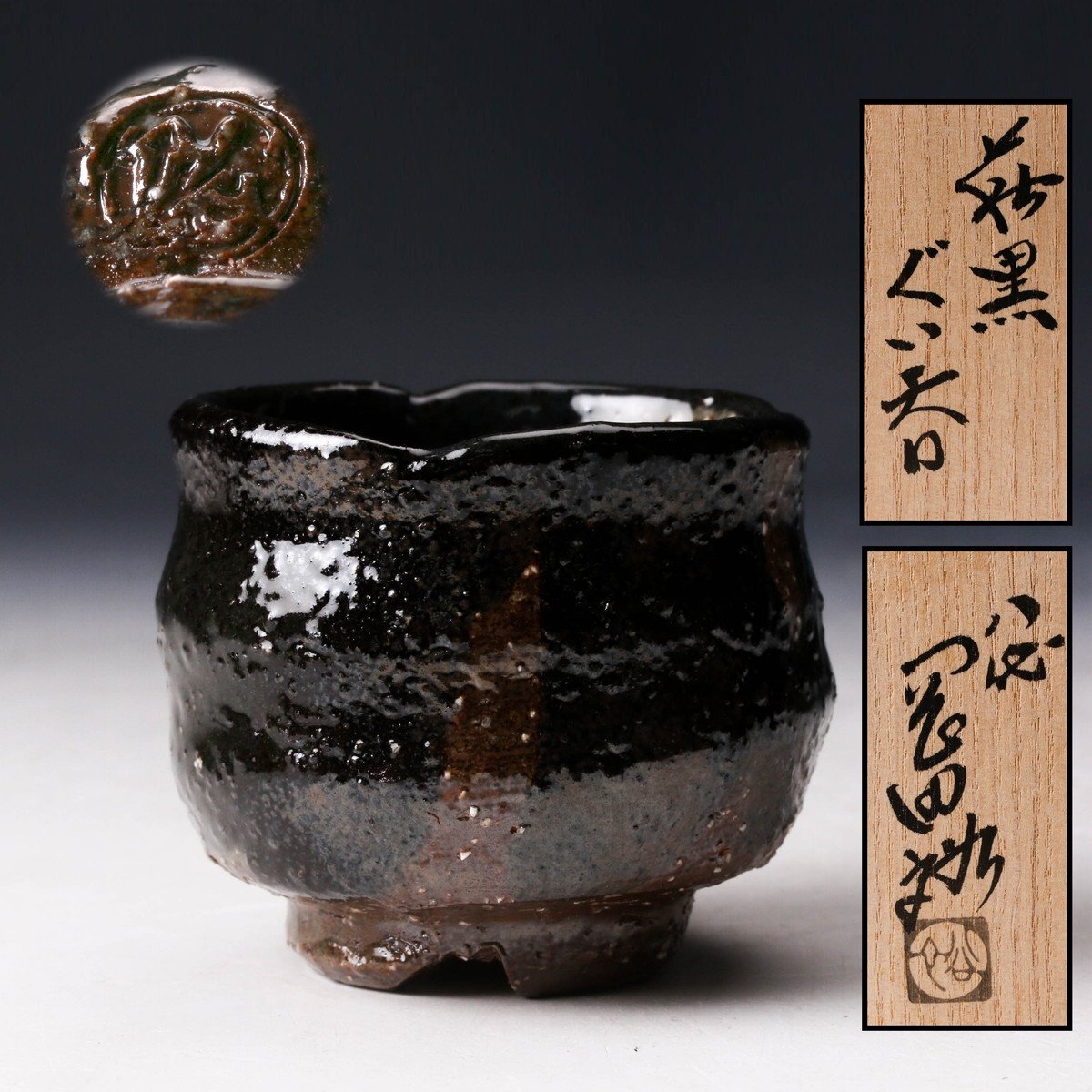 【佳香】八代 岡田裕 萩黒ぐい呑 共箱 共布 栞 本物保証